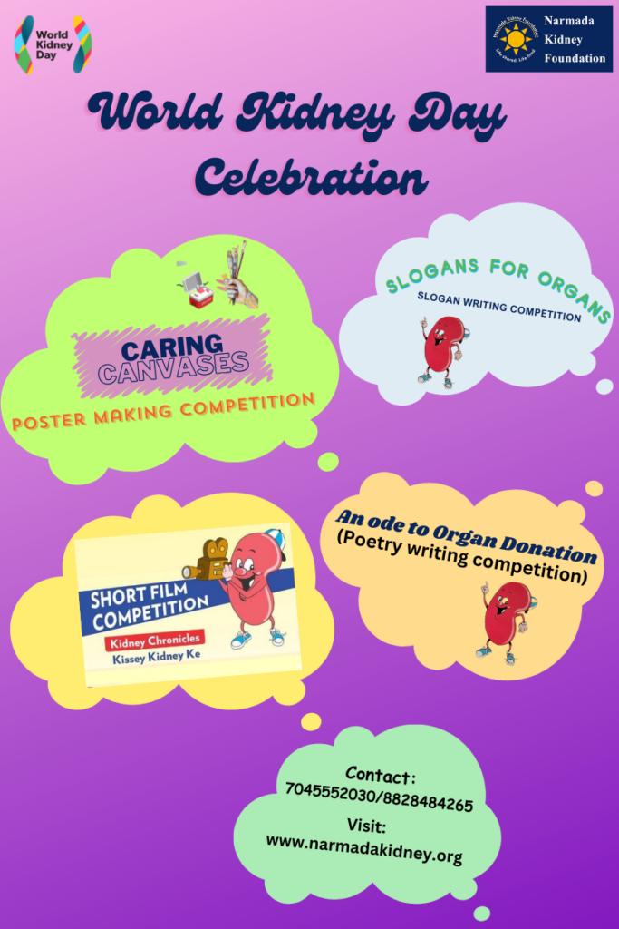 Narmada Kidney Foundation celebrates World Kidney Day by organizing various competitions. The Competitions are open to all with a separate category for student participants. The entry to the competition is free of charge and offers a chance to raise social awareness while earning praise & prizes. This is the best opportunity for everyone to spread the message of Kidney Care and Organ Donation. All participants will receive a participation certificate.